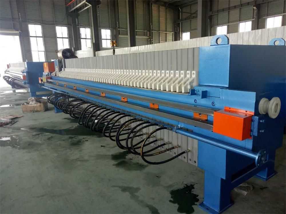 液壓廂式壓濾機由交替排列的濾板和濾框構成一組濾室。濾板的表面有溝槽,其凸出部位用以支撐濾布。濾框和濾板的邊角上有通孔,組裝后構成完整的通道,能通入懸浮液、洗滌水和引出濾液。板、框兩側各有把手支托在橫梁上,由壓緊裝置壓緊板、框。板、框之間的濾布起密封墊片的作用。由供料泵將懸浮液壓入濾室 在濾布上形成濾渣,直至充滿濾室。濾液穿過濾布并沿濾板溝槽流至板框邊角通道,集中排出。過濾完畢,可通入清洗滌水洗滌濾渣。